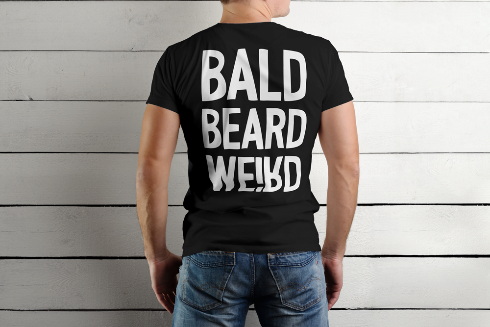 Back print – oversized BALD BEARD WEIRD typography in bold white for maximum impact.
