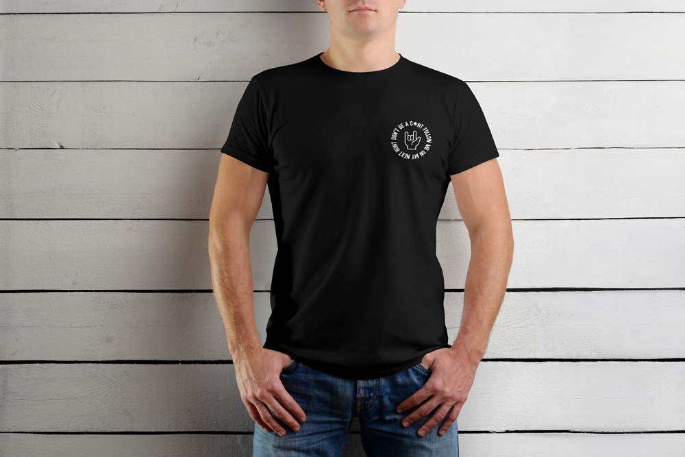 Front chest emblem – a circular insignia with the message “Don’t be a C*nt, follow me on the next hunt” wrapped around a rock hand sign.