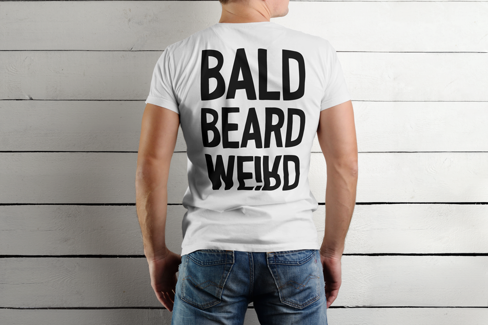 Bold black back print: BALD BEARD WEIRD